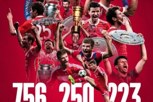 穆勒代表拜仁征战756场,打进250球,贡献223助攻。